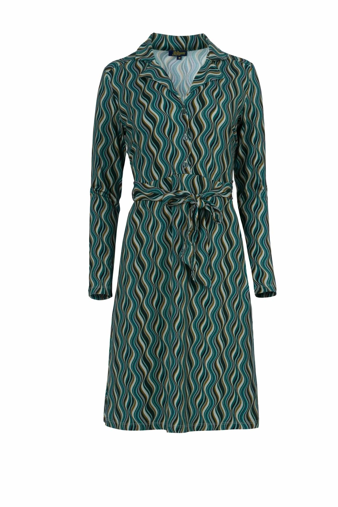 A-lõikeline trikotaažkleit langeb põlvedeni. Klassikalise reväärkraega kleidi eesosa on nööbitav, sel on pikad varrukad ja seotav vöö. Lisaks elegantne vintage muster.