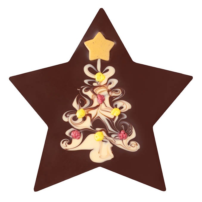 Tumedast šokolaadist šokolaaditäht valgest šokolaadist jõulupuu (17%) ja kaunistustega.