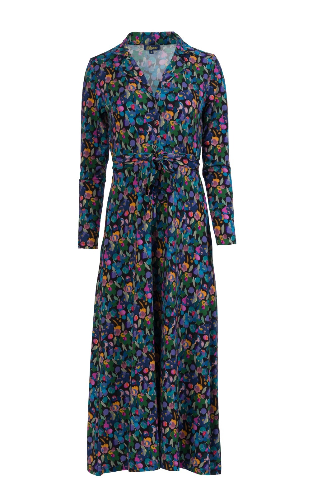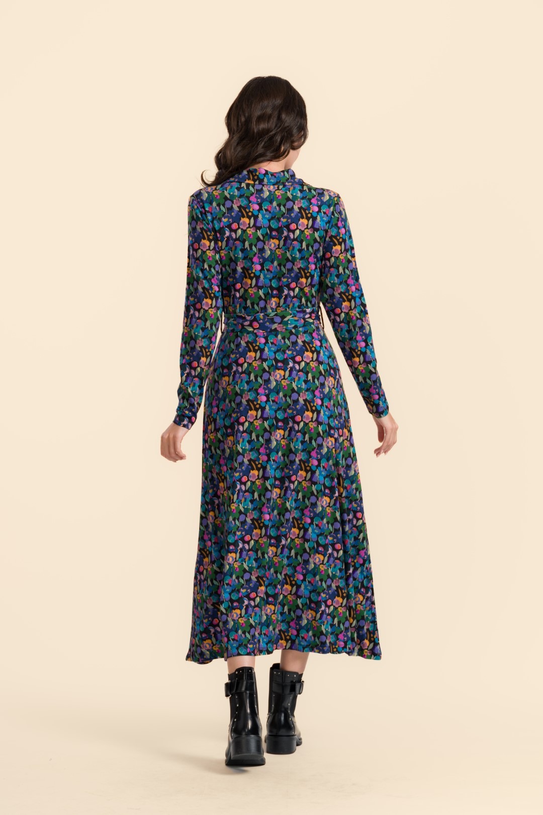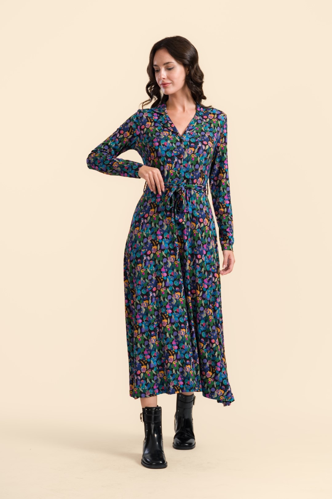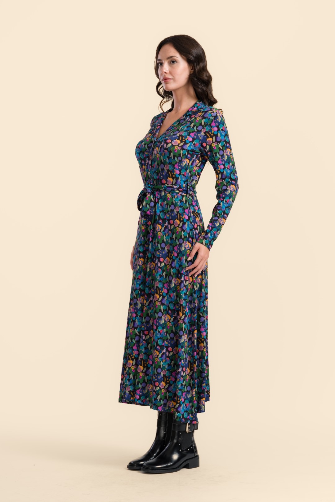 Elegantne ja naiselik A- lõikeline maksikleit, millel on reväärkrae, pikad varrukad ja samast kangast vöö.