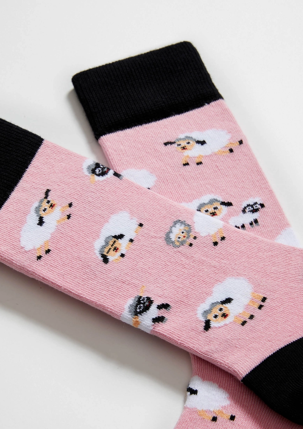 Roosad sokid, mida kaunistavad valged lambad. Varba-, kanna- ja sokisääre üleosa on musta värvi. Talla all must BESOCKS logo.