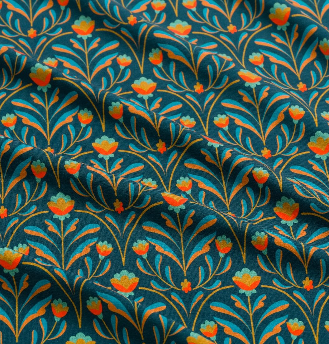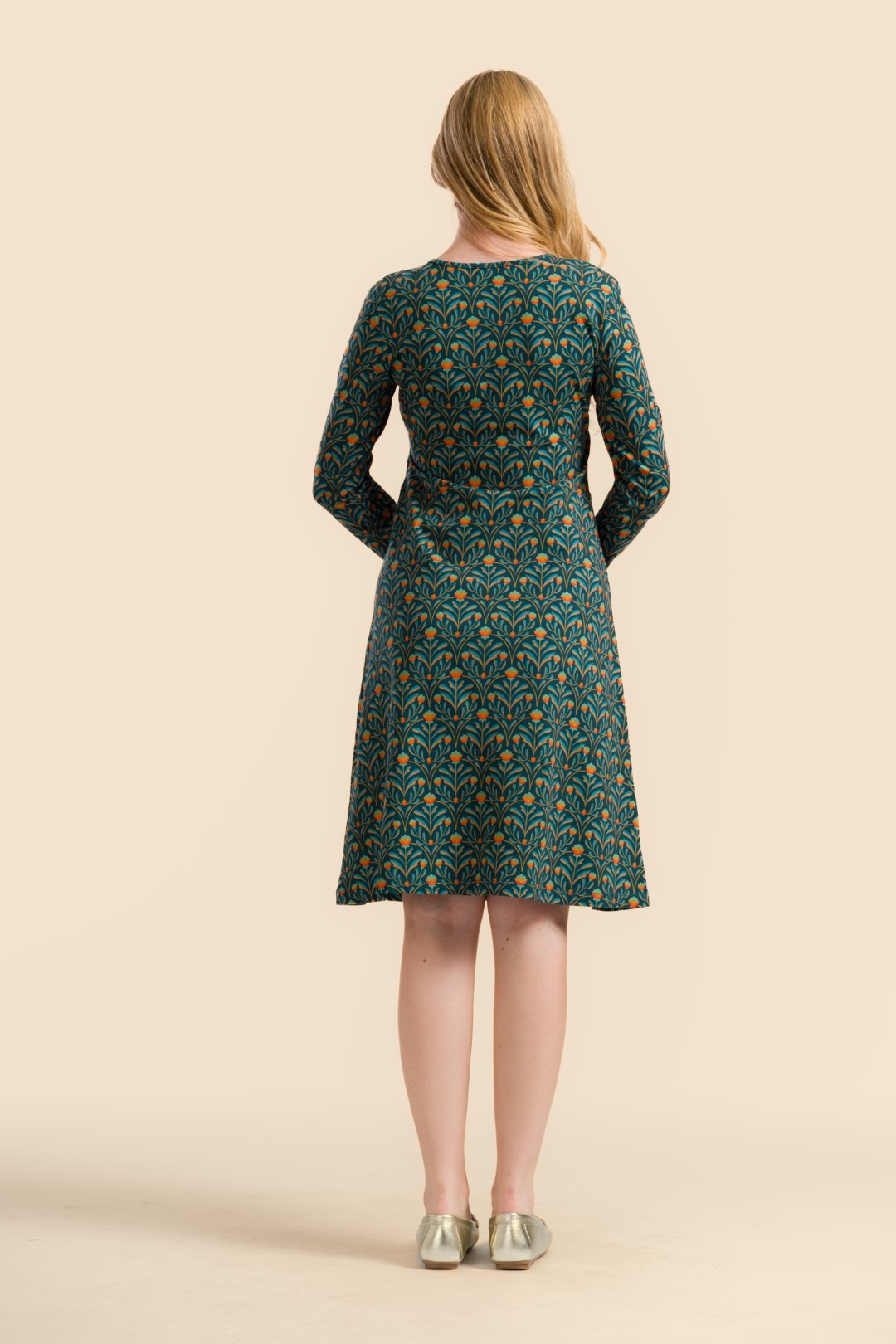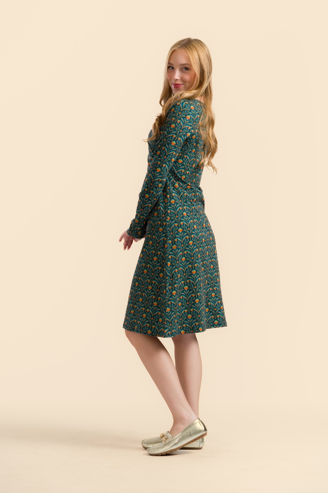 Elegantne ja mugav barokse lillemustriga trikotaažkleit, millel on hõlmikkaelus, pikad varrukad ja vöökohal läbilõige.