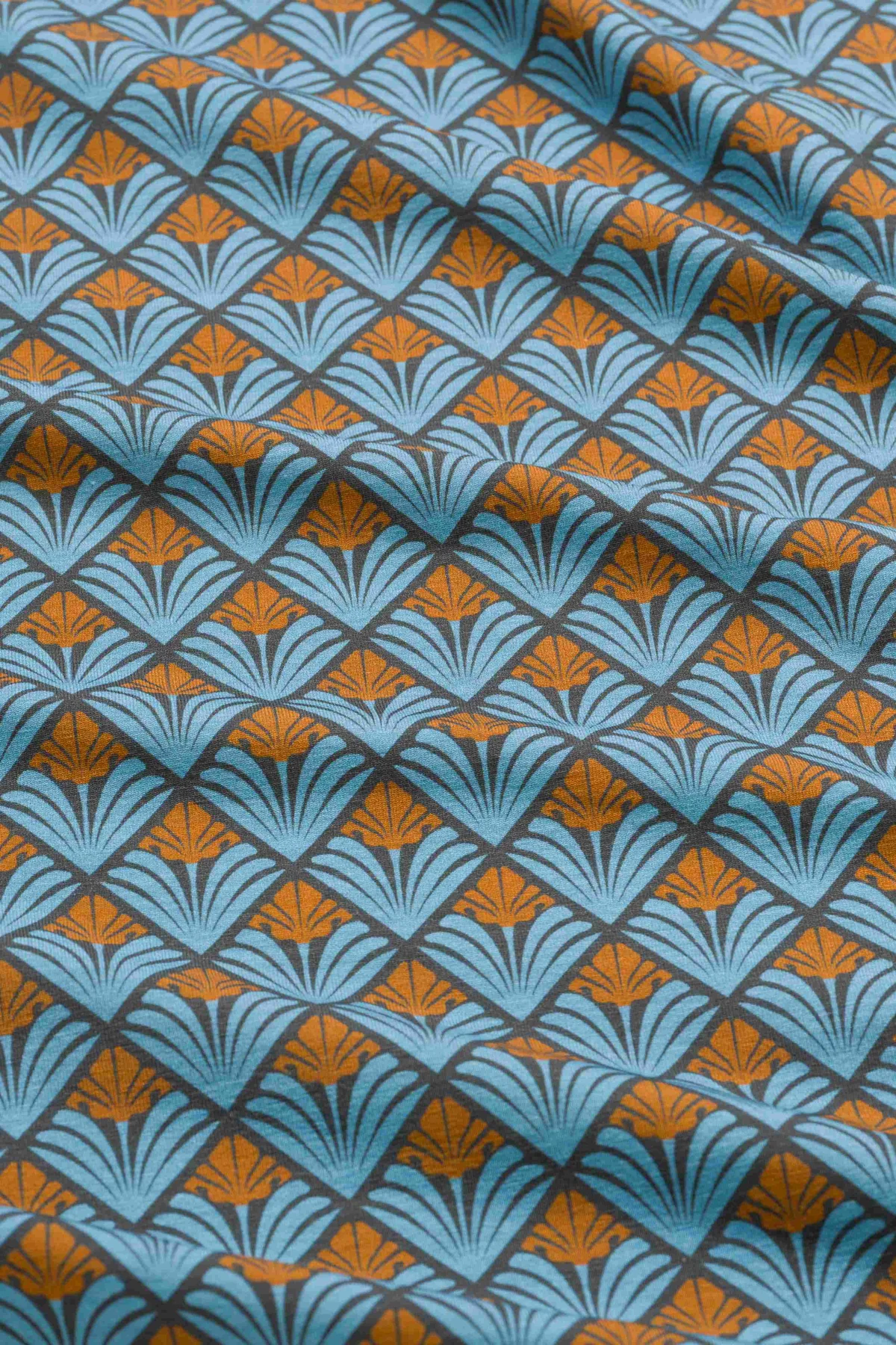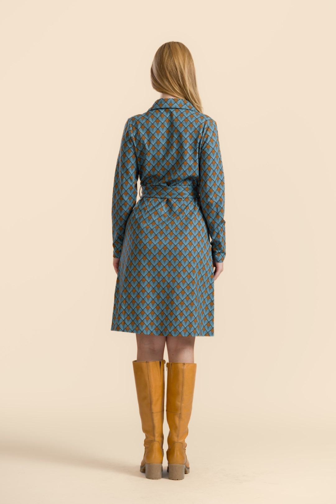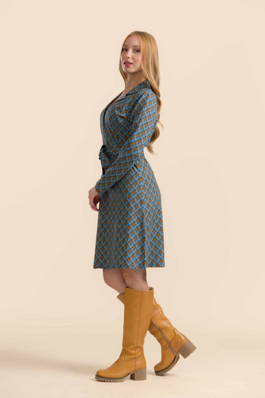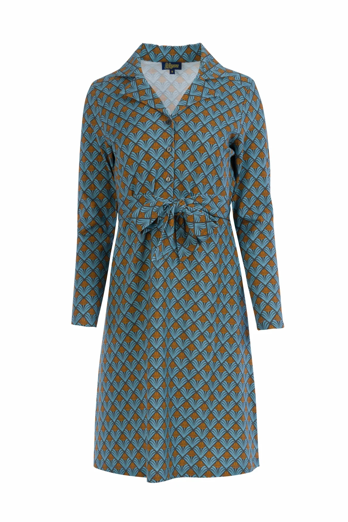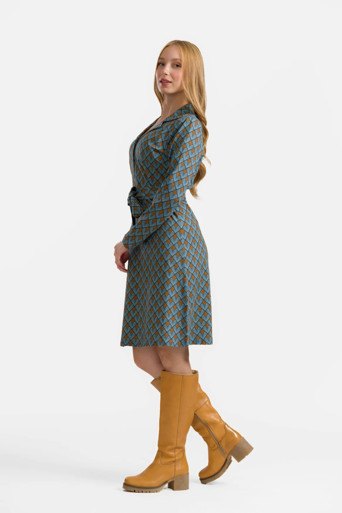 Võluv trikotaažkleit, millel on reväärkrae, pikad varrukad, vöökohal läbilõige ja samast kangast vöö. Kaunistuseks rohelistes toonides geomeetriline lillemuster.