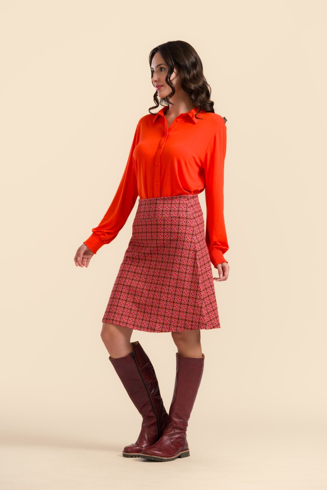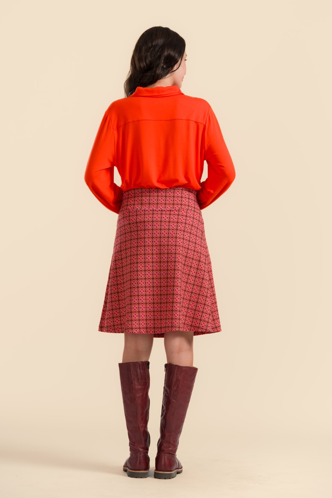 Kahhelkivist inspireeritud mustriga A-lõikeline põlvedeni ulatuv trikotaažseelik, millel on mugav vöökoht ja praktilised taskud.