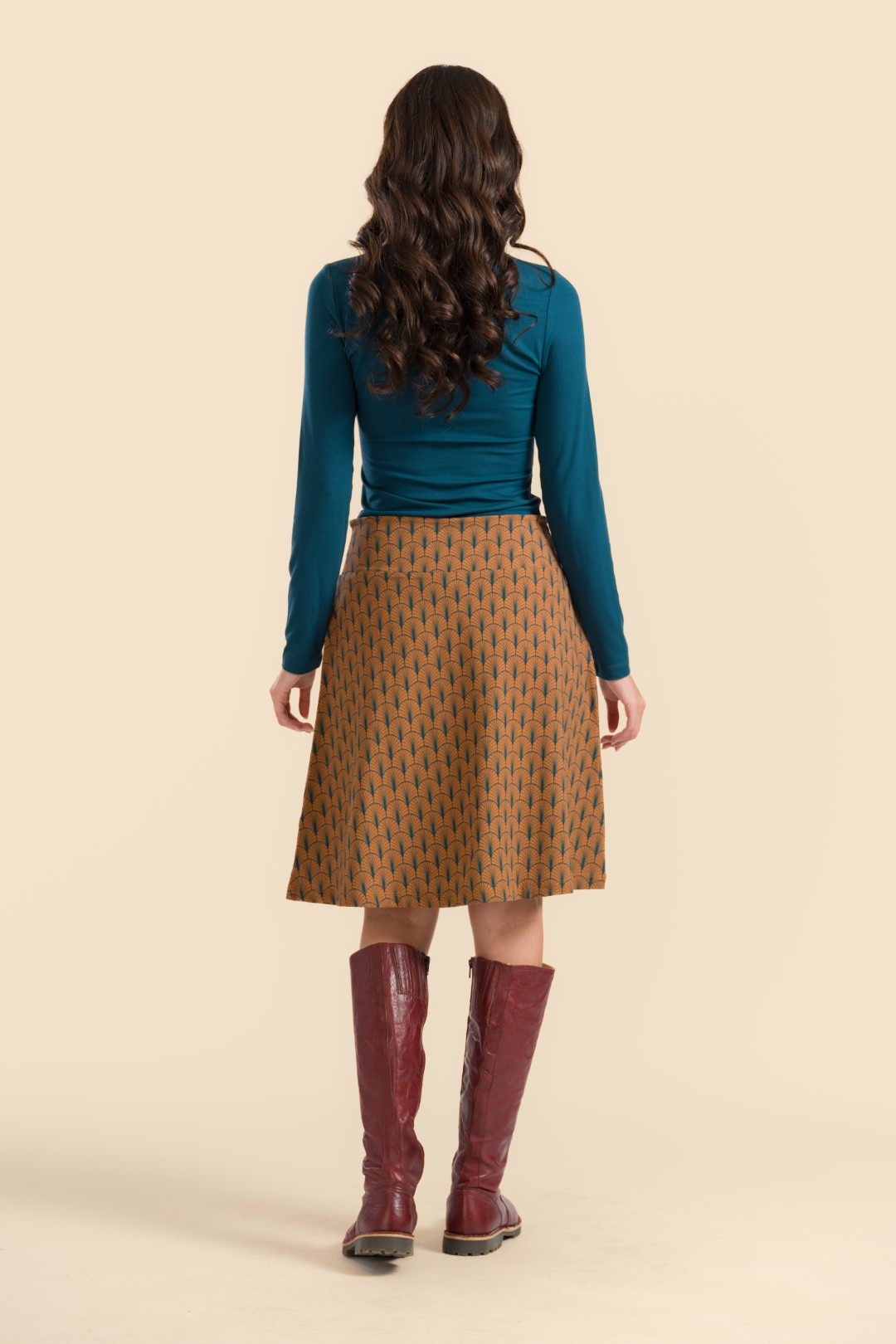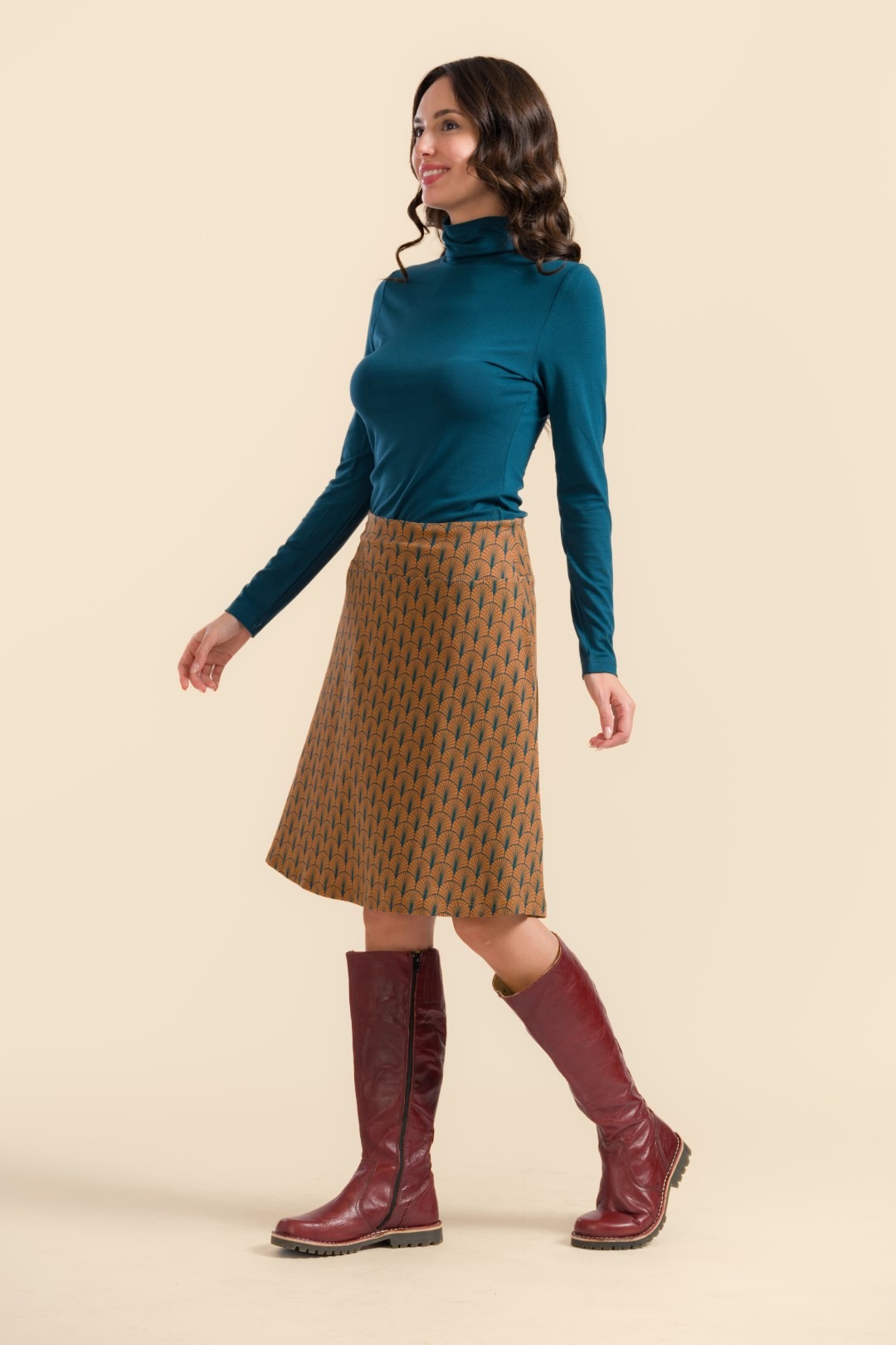 Juugendist inspireeritud mustriga A-lõikeline põlvedeni ulatuv trikotaažseelik, millel on mugav vöökoht ja praktilised taskud.
