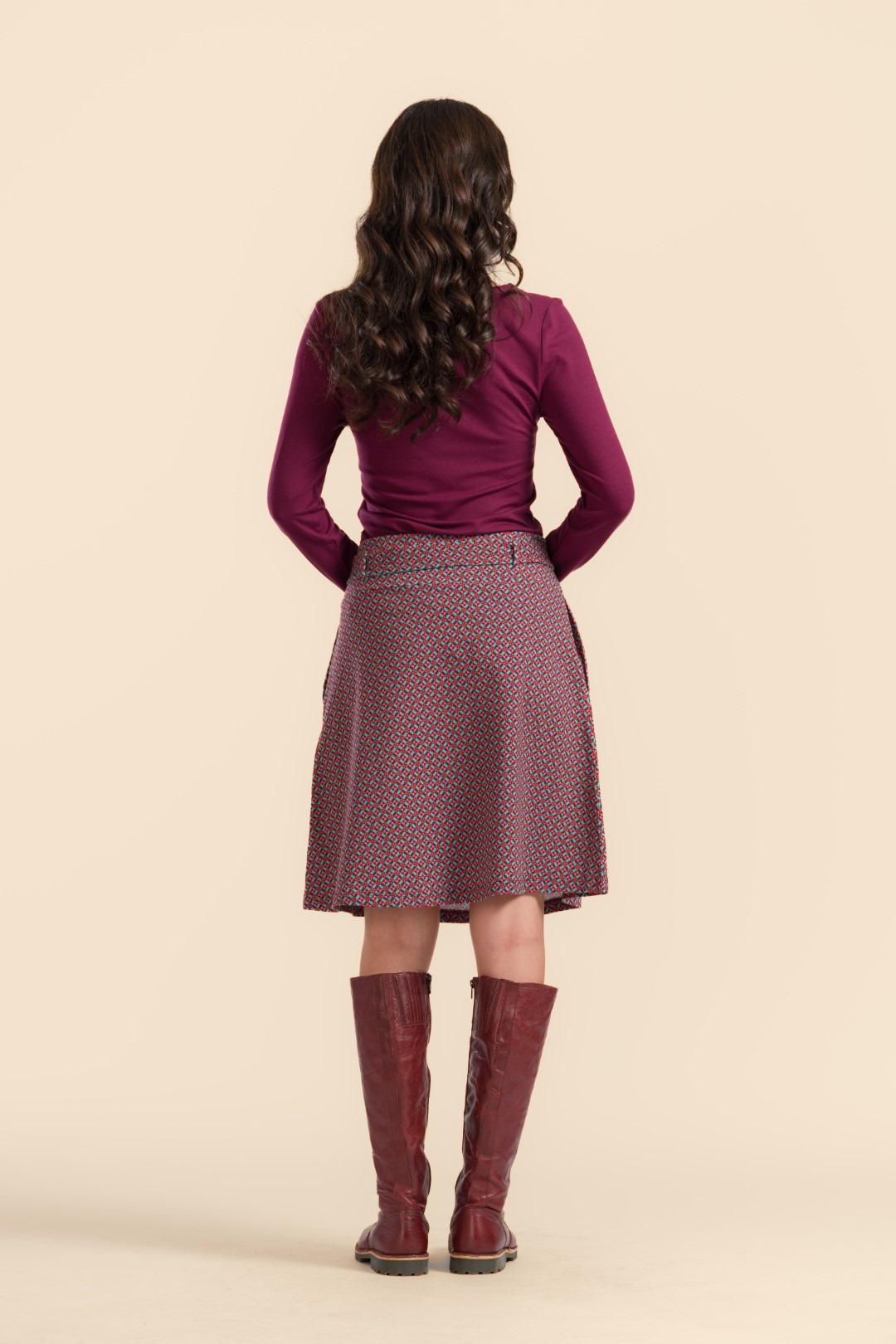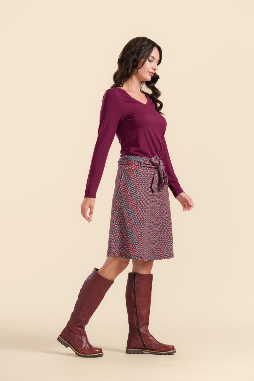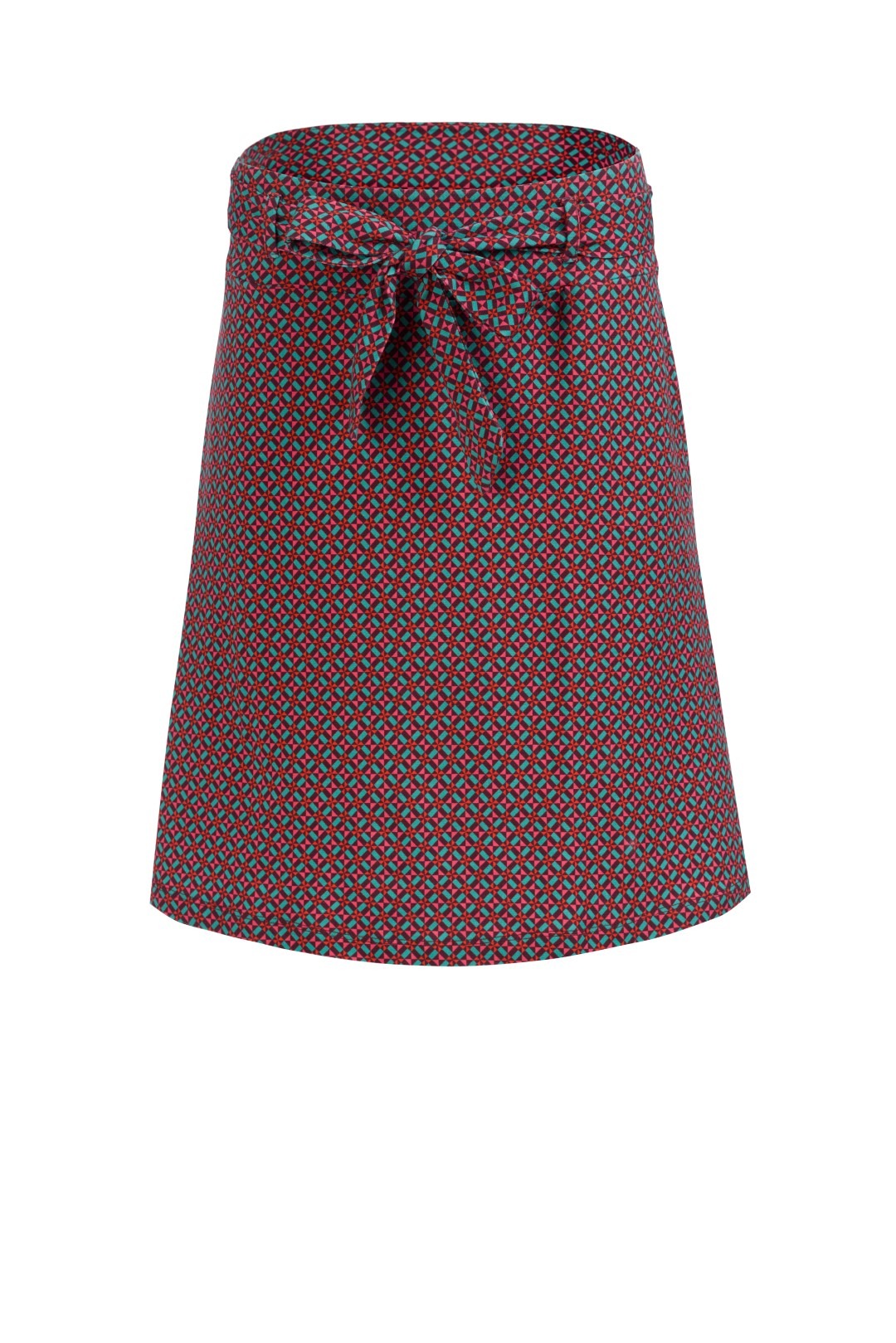 Moekas ja naiselik graafilise mustriga A-lõikeline trikotaažseelik, millel on mugav vöökoht, samast kangast seotav vöö ja praktilised taskud.