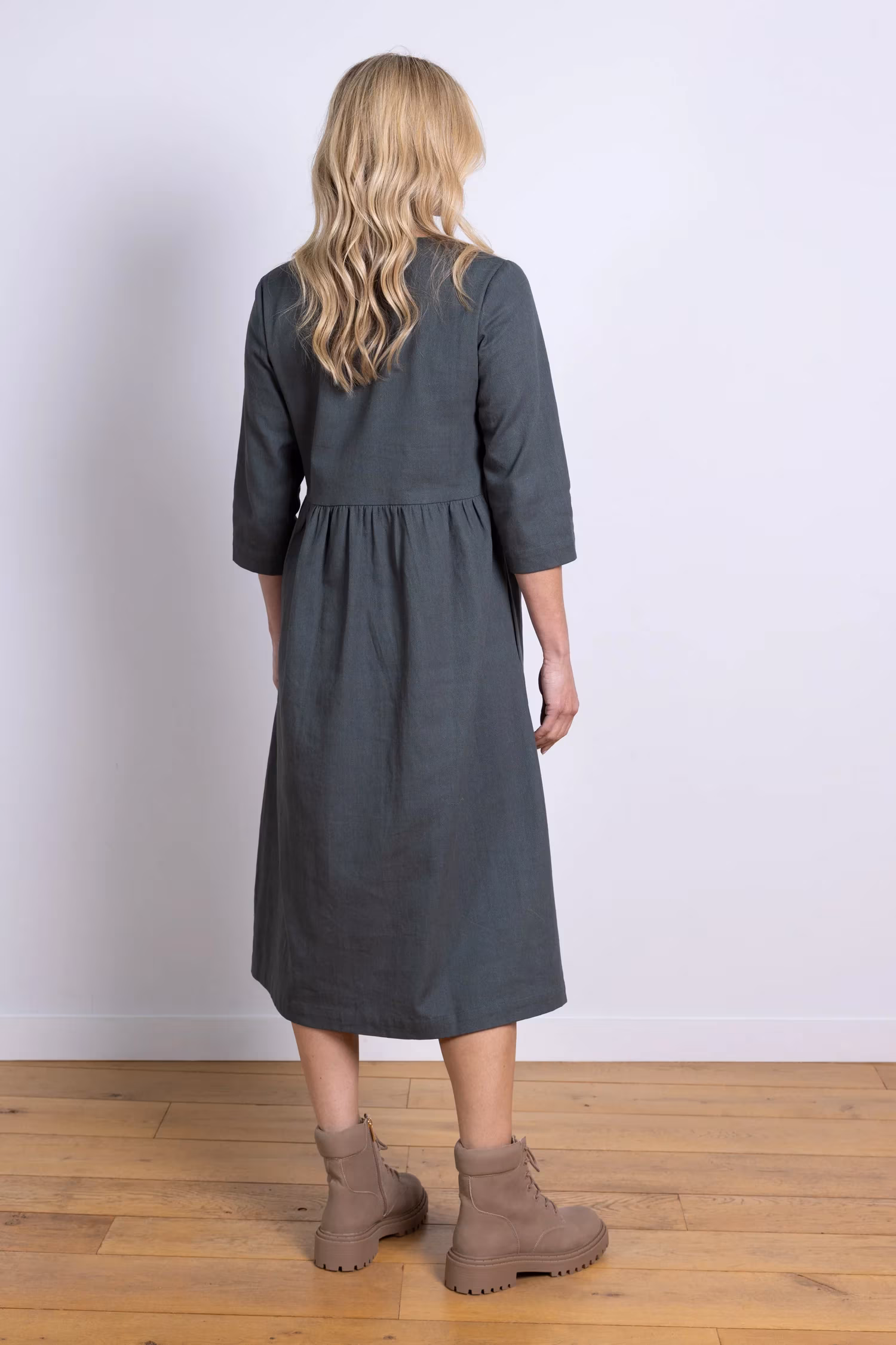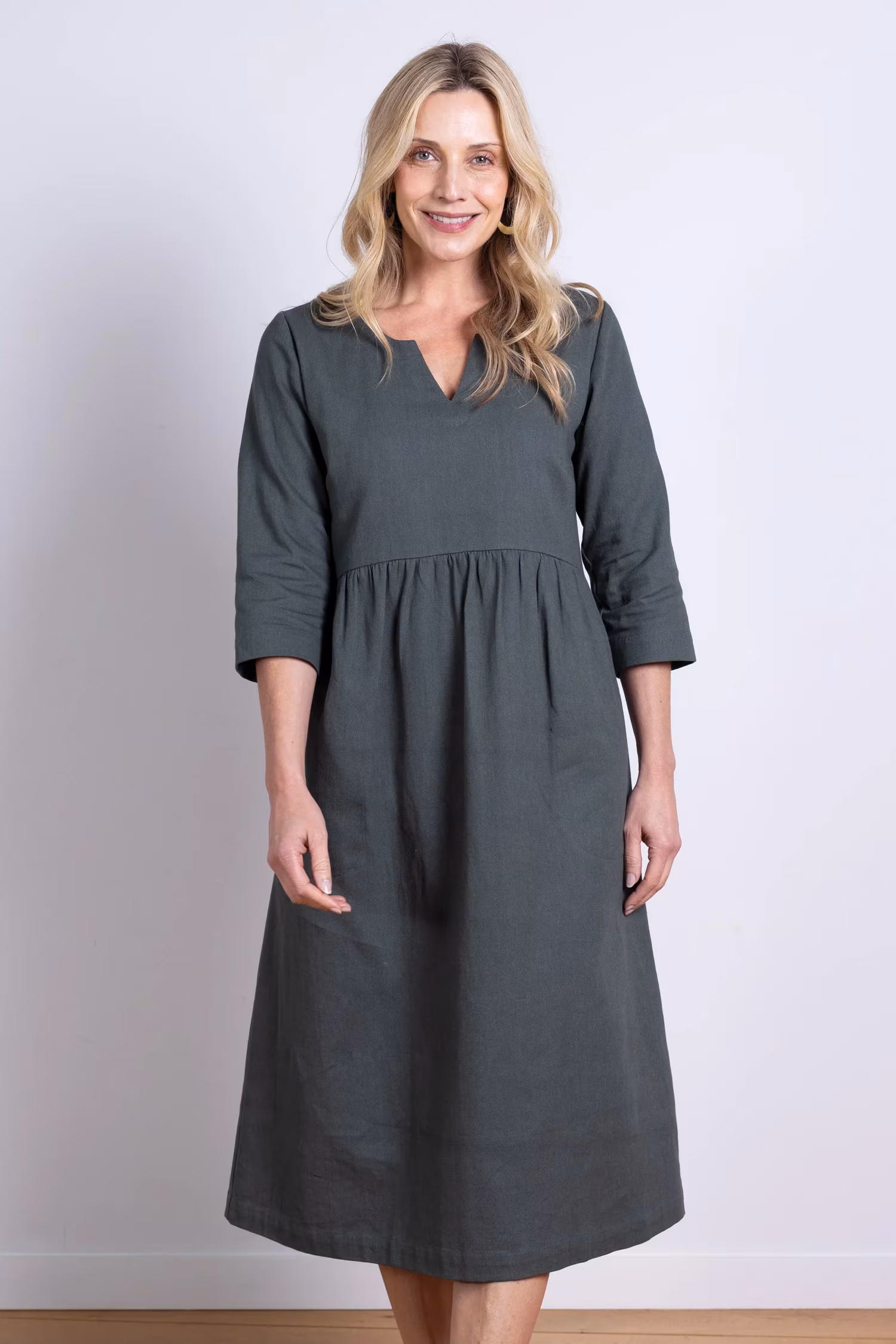 V-kaelusega midikleit ühtaegu stiilne ja mugav. Midi pikkus ja klassikaline V-kaelus loovad korrastatud silueti, 3/4 varrukad ja praktilised taskud lisavad kasutusmugavust.